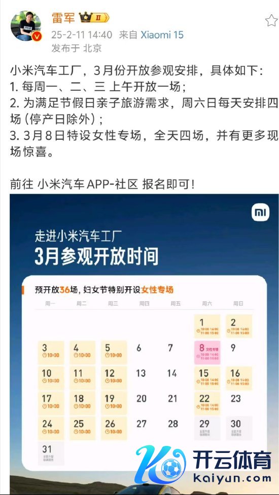 新浪科技讯 2月11日下昼音书开云kaiyun,小米独创东谈主雷军在微博发布了小米汽车工场3月份参不雅安排。