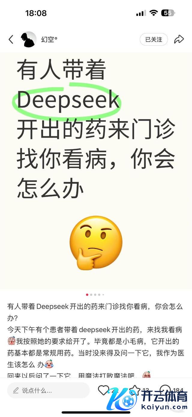 记者拜谒发现,在布置平台上,还有一些医师博主晒出了和“落落寡合”相似的遭逢。2月16日,博主“幻空°”发帖称,上班时遭逢病东谈主拿出DeepSeek的会诊决策,径直找他开药的情况。
